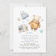Las acogedoras invitaciones a la ducha de bebés con temática invernal incluyen ilustraciones acuáticos de un oso de peluche, un libro y un gorra para bebés. Blanco con acentos azul pastel. El diseño neutral de género es perfecto para un niño o una niña.