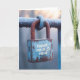 Un candado de amor simbólico con pintura azul descascarada y parches de óxido, atado de forma segura a una valla metalizado. El aspecto caprichoso cuenta una historia de amor perdurable, con un fondo sereno borroso que añade un ambiente romántico y nostálgico. Personaliza con tu propio texto.