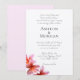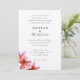 Plantilla de invitación de boda con lugar para ambos conjuntos de nombres de padres mencionados. Los padres están invitando a los invitados en esta redacción de muestra al matrimonio de sus hijos. Se imprimen los nombres de la pareja y el resto del texto es caligrafía para una apariencia elegante. Flores rosa y naranja / frangipani decoran la esquina inferior.
