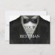 Tarjetas de solicitud de boda de padrino de esmoquin clásico: el fondo es un esmoquin negro formal con corbata de lazo. Dice 'Se solicita su servicio como padrino'. Cambie para personalizar las solicitudes de la fiesta de bodas para todos tus chicos: padrino, groomsmen, portador del anillo y groomsmen junior. ¡Tienes a la chica, ahora es hora de reunir a los chicos!