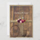 Bonito Invitación rústica casera de campo con madera de granero, rosas rosadas y rojas, plumas, cuerda, botas y una vieja rueda de vagón. Añade tus nombres y la información del boda del personalizar.