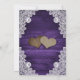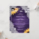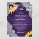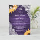 Elegante invitación rústica de boda violeta con girasoles y encaje floral blanco sobre un fondo de madera de granero. Dos corazones en la espalda.