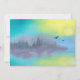 Un paisaje escénico de colores pastel con montañas y abetos en el fondo y un lago turquesa que brilla amarillo con la reflexión del sol. Se pueden ver algunos pájaros volando a lo lejos. Personalice con los detalles de su boda.