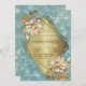 Una paleta azul claro se encuentra frente a un patrón de fondo de cobre/bronce estilo Barogue. Las cartas están decoradas con flores de color crema y hojas de oro sobre un marco en forma de diamante.