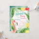 Estas invitaciones incluyen hojas de palma con flores tropicales y flamingo de fondo azul. Esta invitación se personaliza fácilmente para su evento simplemente añadiendo sus detalles.