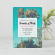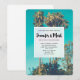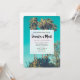 Invitación de boda con una hermosa fotografía. Grandes palmeras con troncos largos frente a un cielo verde encantador. Esquema de colores retro. Relajante y tranquilo.
