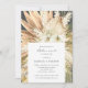 Elegante invitación a la cena previa al boda con un ramo de acuarela boho de palmeras de abanico, pampas, orquídeas blancas y hojas secas en tonos tierra natural. Cambie fácilmente el color de fondo y el estilo de fuente para que coincidan con el tema boda. Invitaciones de coordinación y accesorios disponibles en la tienda.