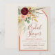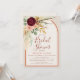 Celebrate the bride to be with this Boho Floral Arch Bridal Shower invitation, featuring an elegant watercolor floral bouquet of burgundy red chrysanthemum blooms, blush pink roses, eucalyptus greenery, pheasant feathers, dried pampas grass foliage, golden autumn leaves and more. The design is framed by a graceful yet modern arch in warm terracotta rust orange and soft oatmeal beige for a natural, earthy feel. With its modern rustic boho style, this invitation sets the perfect tone for a western, boho, or fall celebration. Pair with coordinating signs, thank you cards, games, favors, and décor from the Boho Floral Arch event suite for a beautifully cohesive bridal shower.