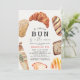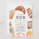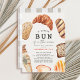 Esta linda invitación de shower de bebé género-neutral "un pequeño bollo en el horno" presenta varios tipos de panes, como croissant o baguette en acuarela. El reverso presenta un fondo blanco con cuadros de gingham beige. Personalízala según tus necesidades. Puedes encontrar productos relacionados en mi tienda.