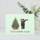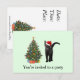 Un gato negro con un sombrero de Papá Noel y un árbol de Navidad decoran esta invitación de fiesta para Navidades