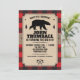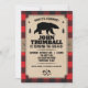 Un fondo de cuadro de búfalo rojo contrasta con un panel de aspecto de papel kraft sujeto por una correa de arpillera en esta invitación temática de Northwoods. El panel contiene la información de la fiesta con un oso entre dos pinos. El hacha cruzada forma un logotipo personalizado debajo. Ideal para un cumpleaños, despedida de soltero, evento de temporada o una celebración temática de cuadro de búfalo o leñador. Disponible con productos coincidentes.