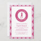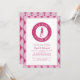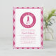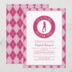 La invitación personalizada para fiesta de cumpleaños de golf femenino presenta una silueta de golfista femenina en rosa sobre una forma blanca bordeada con texto curvo humorístico "¡Es hora de Par Tee!" en fuente blanca crujiente sobre un círculo rosa. Personalice la plantilla con el nombre y detalles en letra rosa coincidente y escritura. La invitación está bordeada con un cuadriculado estilo argyle rosa de dos tonos que también se repite en el reverso de la invitación.