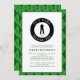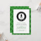 El diseño personalizado de la invitación a la fiesta de cumpleaños del golf masculino incluye una silueta de golf masculina en un conjunto negro clásico sobre una forma blanca bordeada por un texto curvo humorístico "¡Es hora de ir al bar!" en un color blanco crujiente sobre un círculo negro. Personalizar la plantilla con el nombre y los detalles en letras clásicas en negro y verde. La invitación está bordeada por una plancha de estilo argyle de dos tonos que se repite al final de la invitación.