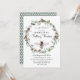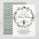 Una invitación única para baby shower con tema de mamá abeja, que incluye abejas y una corona floral botánica de eucalipto y algodón. Patrón de panal en el reverso de la invitación.