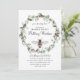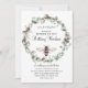 Una invitación única para baby shower con tema de mamá abeja que presenta abejas y una corona floral botánica de eucalipto y algodón. Patrón de panal en el reverso de la invitación.