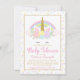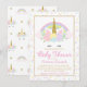 Invitaciones para baby shower de unicornio con adorable cara de unicornio floral rosa con cuerno dorado y arcoíris y puntos pastel y fondo de cara de unicornio. Estas lindas invitaciones para baby shower de unicornio se personalizan fácilmente para su evento simplemente agregando sus datos.