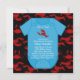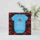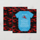 La invitación para la fiesta de bienvenida de un adorable bebé varón presenta un fondo de langostas negras y rojas, cangrejos y bogavantes, y un bogavante en la parte frontal de esta adorable invitación para la fiesta de bienvenida del bebé varón de color rojo y negro. Agregue sus detalles en la parte frontal y/o posterior simplemente eligiendo el botón naranja "Personalizar" para comenzar a agregar los detalles del evento, el estilo de fuente, el tamaño y color de la fuente, y la redacción. Tenga en cuenta que todos los diseños de invitaciones que encontrará en Zazzle son gráficos impresos en papel plano sin joyas reales, lazos, partes o piezas en relieve, estampadas o agregadas.