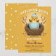 Adorable invitación para baby shower con un dulce pollito amarillo que sale de un huevo azul en un nido acogedor, rodeado de delicadas flores rosadas de primavera.