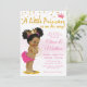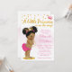 Invitaciones para baby shower de princesa con adorable princesa bebé afroamericana vistiendo un lindo tutú rosa y collar de perlas sobre un hermoso fondo dorado brillante y diamantes.