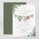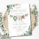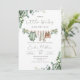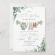 Una encantadora invitación de baby shower de niño en acuarela con suave vegetación de eucalipto y adorables ropas de bebé colgadas de una cuerda de ropa rústica. Este diseño elegante incluye dulces detalles de bebé como ropa de bebé, zapatos diminutos, biberón y chupete, creando un ambiente cálido y acogedor para celebrar la llegada de un pequeño niño.