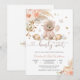 Celebra tu día especial con esta adorable invitación de baby shower con tema de osito que presenta a un dulce osito de peluche sosteniendo globos, rodeado de flores pastel, mariposas y acentos caprichosos del bosque. Perfecta para homenajear a los futuros padres, este diseño elegante combina tonos suaves de durazno, rosa y beige para una apariencia cálida y acogedora. Personaliza con los detalles de tu evento para crear un recuerdo memorable que tus invitados apreciarán. Ideal para baby showers, fiestas de revelación de género y celebraciones de hitos importantes.