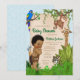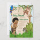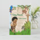 Invitaciones para baby shower safari de niño con bebé afroamericano con adorable cabello afro y animales de safari en un fondo de jungla de damasco azul. Esta invitación para baby shower safari de niño se personaliza fácilmente para su evento simplemente agregando su texto.