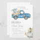 Esta adorable invitación para baby shower es la manera perfecta de establecer el tono para tu pequeño ser querido. El diseño de acuarela presenta un pequeño elefante adorable en la parte trasera de una clásica camioneta azul pintada a mano con acentos de calabazas y follaje otoñal que lo rodean,