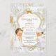 Invitación para bautizo con dos gemelos vestido para el bautismo. El fondo de la invitación es blanco y dorado, con un marco dorado y plata como adorno. La parte posterior está adornada con el estampado de flores de oro y cinta dorada en un fondo blanco