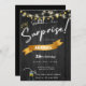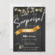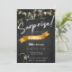La sencilla y minimalista invitación digital de cumpleaños sorpresa en blanco y negro con fondo de madera y plato dorado.