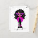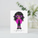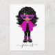 Invitación de cumpleaños con una linda niña negra con una chaqueta rosa de crochet, botas y gafas de sol.