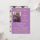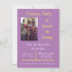 Imagen de niña cumpleañera y princesa sobre fondo morado en la parte frontal con detalles de la fiesta e imágenes de margaritas en la parte trasera.