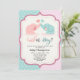 Invitación para la fiesta de revelación del género de tu bebe, con fondo verde azulado y rosa con lunares con un elefante y una elefanta.