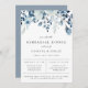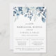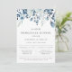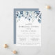 Arreglo floral de acuarela en tonos de azul polvoriento y azul marino, invitación para la cena de ensayo. Diseño de tipografía chic y moderno. La parte trasera de la tarjeta presenta un color azul polvoriento sólido.