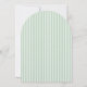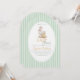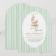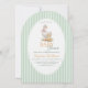 Esta encantadora invitación para baby shower presenta una suave ilustración de acuarela vintage de Mother Goose y Gosling, creando una historia cálida y tierna de amor y cuidado. La delicada obra de arte está enmarcada en una elegante forma ovalada y colocada sobre un fondo clásico a rayas verdes pastel, inspirado en diseños atemporales de guarderías y libros de cuentos.