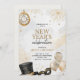 Invitación para una celebración de Año Nuevo con un reloj, fuegos artificiales, sombrero de copa, máscara y globos. Tonos elegantes dorados y plateados transmiten una atmósfera festiva.
