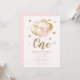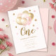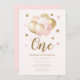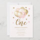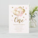 Invitación a la fiesta de primer cumpleaños del chica con globos de oro y rosa que se pueden personalizar fácilmente para incluir el nombre y los detalles del fiesta de tu pequeño. El diseño presenta globos dulces en oro y rosa y el tipo de letra es de color dorado. La fachada de la invitación es de color rosa muy claro y la parte trasera de la invitación está en un tono rosa oscuro y dulce. El diseño es bonito, moderno y moda, perfecto para tu niñita.