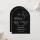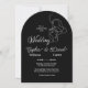Elegante tarjeta boda en blanco y negro con un minimalista ilustracion de arte lineal y una refinada tipografía. El audaz fondo negro con texto blanco crea un estilo sofisticado y atemporal, ideal para bodas lujosos, con corbata negra o modernos. La caligrafía romántica para los nombres combinados con tipos de letra serif clásicos para los apellidos añade encanto y legibilidad. Personalizable completo: personalice nombres, fecha, hora y lugar para su celebración especial. Ideal para parejas que buscan una moda y un estilo artístico de papelería.