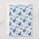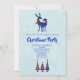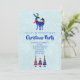 Una invitación a una fiesta de Navidad con un fondo verde claro y blanco con aspecto nevado. Ilustrado con una pareja de ciervos escandinavos azules que llevan bufandas rojas. Con diseños decorativos en sus cuerpos. Un trío de árboles de Navidad de estilo nórdico en azul y rojo con estrellas en la parte superior, debajo del texto.