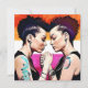 Mujeres lesbianas LGBTQIA+ o invitaciones de boda transgénero. Dos bellas lesbianas o transgénero con mohawks, piercings y tatuajes. Bandera lesbiana de fondo.