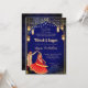 Invitación de Mehndi y Sangeet con fondo azul marino y pareja de novios indios bailando. Con marco de arco dorado, linternas marroquíes y luces de hadas. Om es una letra que se puede copiar y pegar, se puede eliminar o reemplazar con otro símbolo disponible en el teclado.