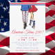 Celebre el cumpleaños número 250 de Estados Unidos con estilo con esta invitación de fiesta preppy y patriótica que presenta a una pareja de moda vestida de rojo, blanco y azul. El diseño presenta a un apuesto hombre con pantalones de estampado de bandera y una chaqueta azul, sosteniendo una cerveza, con su brazo alrededor de una mujer con un vestido rojo y tacones azules, creando la combinación perfecta de diversión, moda y espíritu americano.