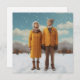 Pareja retro de aspecto serio con ropa amarilla cálida en la nieve del invierno