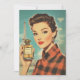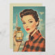 Un glamuroso afiche vintage de los años 50 con una sofisticada mujer de manta roja sosteniendo una botella de perfume de lujo con la etiqueta "PERFUME". La Torre Eiffel se eleva al fondo, realzando la estética parisina de moda con colores llamativos, la moda retro y la belleza clásica.
