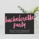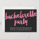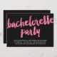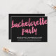 Esta invitación a una soltera de color negro y rosa brillante presenta un guión de caligrafía en negrita, un efecto purpurina falso rosa y un fondo negro. Personalice los detalles del fiesta y agregue fotos o texto a la parte posterior de la tarjeta si lo desea.