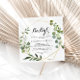 Esta invitación geométrica de oro tropical BabyQ baby ducha barbacoa es perfecta para parejas simples con duchas de bebé o rociadas de bebé. El diseño está decorado con hermosas hojas verdes pintadas a mano, adornando un marco geométrico dorado.