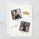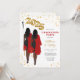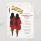 Invitación de la Fiesta de Doble Graduación de América Africana. Celebración de la fiesta de graduación combinada de las mellizas. Retrato de mujeres gemelas con el pelo largo oscuro en vestidos negros con túnicas de graduación rojas y gorras de graduación con globos dorados para la clase de 2025. Presenta ambos gemelos en la parte posterior de la tarjeta con sus fotos, nombres, escuelas y grados.