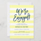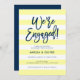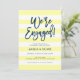 Invitación del Partido de Compromiso con estilo que incluye las palabras "Estamos comprometidos" en un guión de pincel azul a la moda contra un fondo de rayas amarillo y blanco pastel. La tarjeta tiene un color azul en la parte posterior. Vea otros elementos coincidentes aquí https://www.zazzle.com/collections/119250194970828530?rf=238364477188679314 Personalícelo reemplazando el texto del marcador de posición. Para obtener más opciones, como cambiar el tipo de letra y su tamaño/color o el espaciado entre letras, haga clic en el botón "Personalizar". *Tenga en cuenta que la marca de agua Zazzle que aparece en la vista previa del zoom NO aparecerá en el producto impreso final. © Rosewood y Citrus