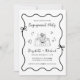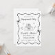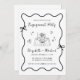 Invitación a una fiesta de compromiso boda de inspiración retro con un marco ondulado único adornado con arcos de coqueta y extravagantes ilustraciones de corazones, estrellas y una elegante mesa romántica. "Partido de compromiso" y los nombres de la novia y el novio se muestran en un guión divertido.