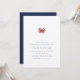 Celebra tu amor con nuestras elegantes invitaciones de verano a la fiesta de compromiso, con un estilo náutico clásico con un aspecto limpio y minimalista y un toque alegre de vida marina. El diseño presenta un pequeño ilustracion de cangrejo rojo en la parte superior, con elegantes bloques y letras cursivas en azul marino. Perfecto para las fiestas náuticas, de verano o de playa, sobre todo si el cangrejo está en el menú.