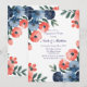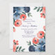 Un delicado ilustracion acuático de un ramo boda con flores color azul claro, azul oscuro, coral y rosa claro. La paleta de colores suaves y la acuarela crean un diseño romántico y elegante, perfecto para materiales relacionados con el boda.